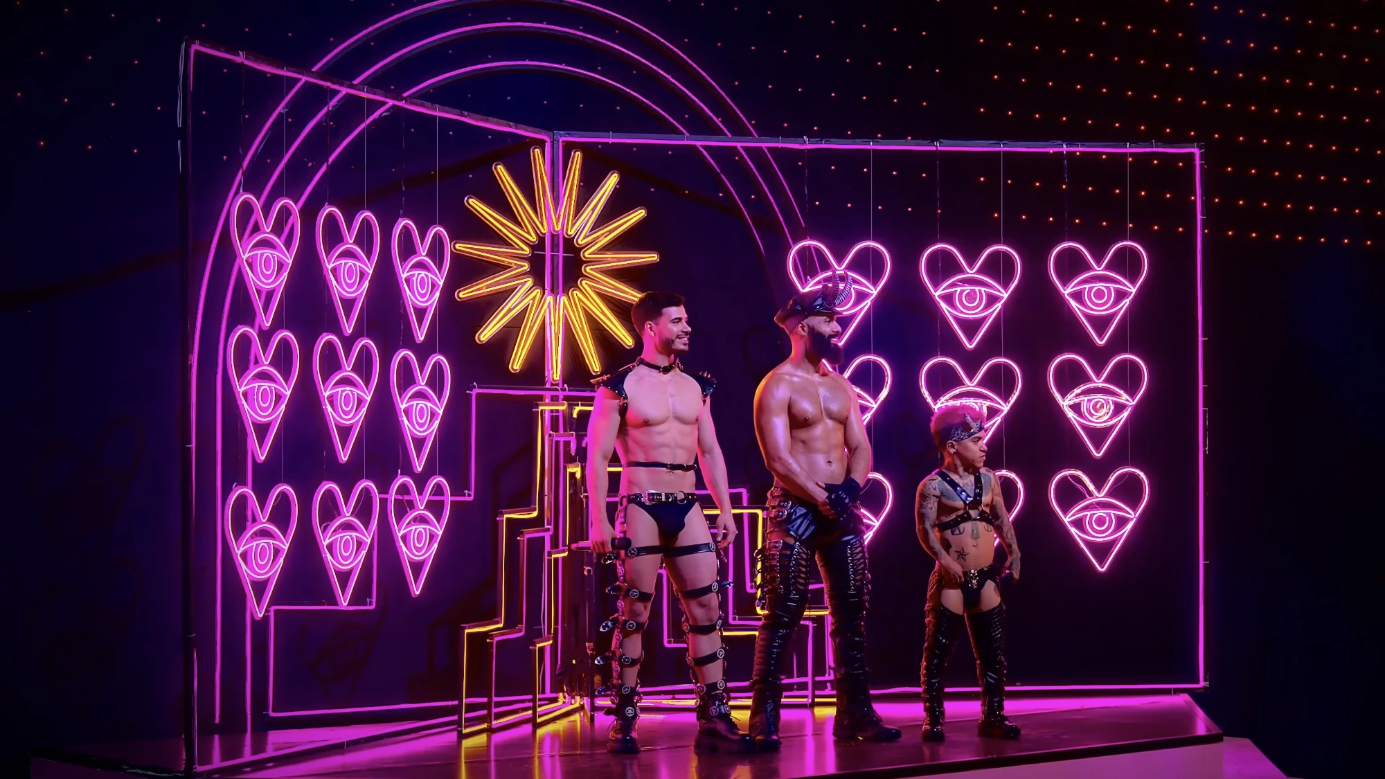 Los Venenos are a group of men who appear on each season of La Más Draga: Solo Las Más. The men of the crew are typically not much dressed, usually donning leather and elements of clothing associated to the related subculture. Their main role is to aid the judges and contestants in various challenges of the show.